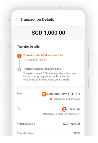 Transfers are made directly in the app, with exchange rates shown upfront before confirmation. MariBank can also receive overseas transfers, but in SGD only. That works well if your clients pay in SGD, but if they pay in other currencies, you may need an additional solution to avoid extra conversion costs.